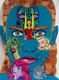 I like his art work because it reminds me of how children cover themselves in fake tattoos. I think he draws the portraits first and then covers them with the small paintings to give them this effect/look.